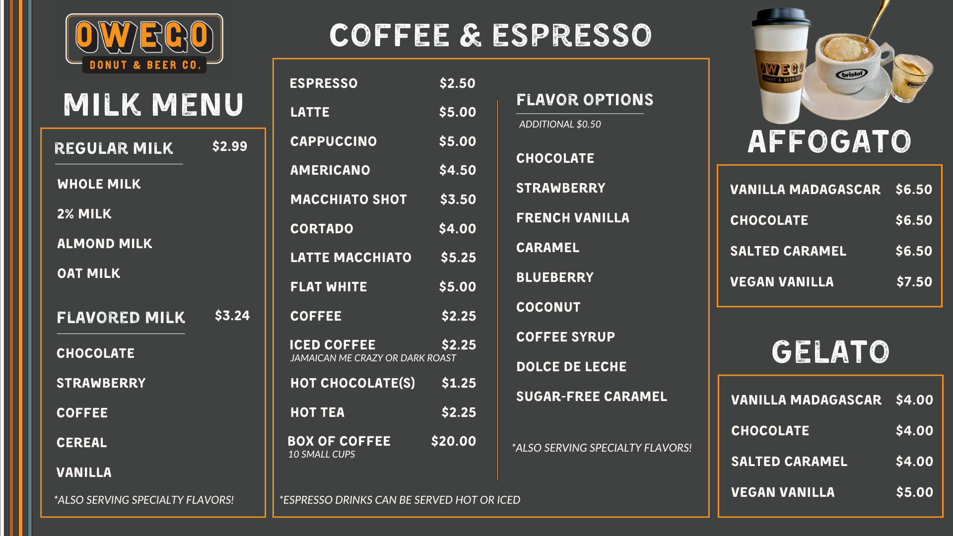 Hot or Iced Coffee and Espresso Drinks Available with Your Choice or Milk and A Full List of Flavor Options to Choose From! Enjoy Here with a Donut or Take It To Go!